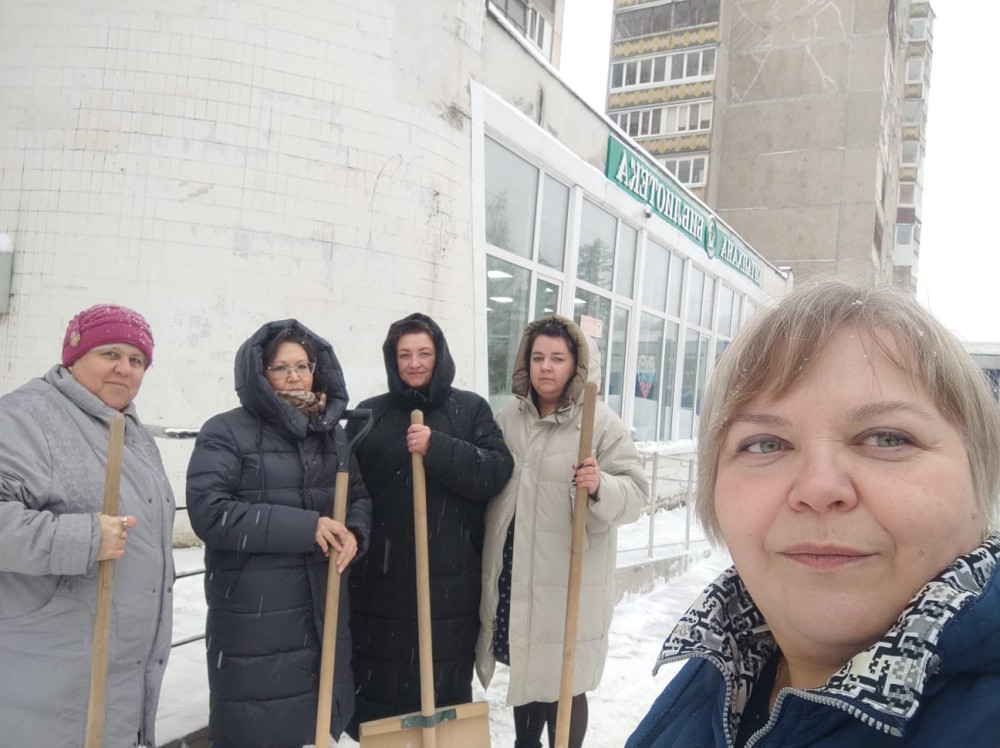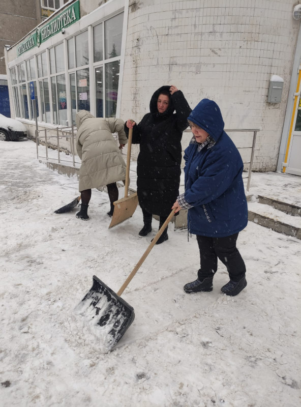 В снежный зимний день сотрудники модельной библиотеки №32 вышли на очистку снега прилегающей территории.