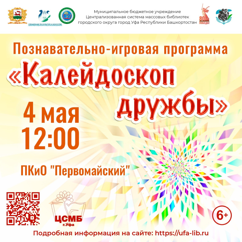 4 мая в 12:00 приглашаем вас в Парк культуры и отдыха «Первомайский» погрузиться в атмосферу радости, веселья и творчества вместе с познавательно-игровой программой «Калейдоскоп дружбы», организованной массовыми библиотеками города в рамках фестиваля национальных культур «Уфа – город дружбы и единства», который будет посвящен 80-й годовщине Победы в Великой Отечественной войне 1941-1945 годов. Это мероприятие станет настоящим праздником общения, познаний и приятных встреч.