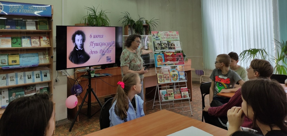 В начале мероприятия ребята с помощью книжной выставки «Поэзия чудесная страна» вспомнили о творчестве А. С. Пушкина.