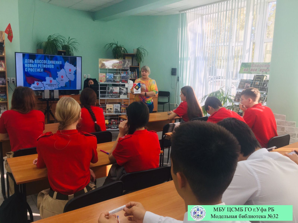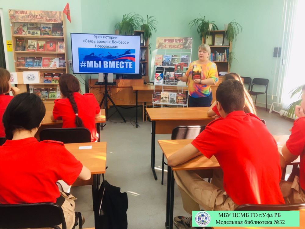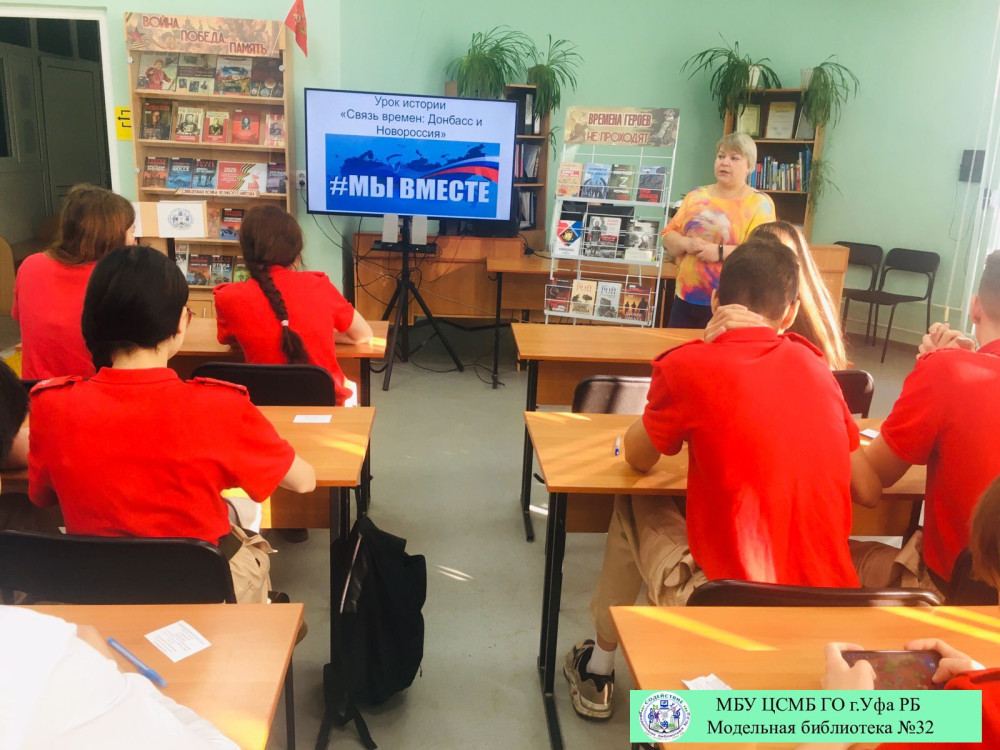 В Модельной библиотеке №32 состоялся урок истории для учащихся 10 класса МАОУ Школа №157 им. С.Х. Суфьянова на тему «Связь времен: Донбасс и Новороссия». Это мероприятие было организовано в рамках Всероссийской акции «Спасибо, что #МЫВМЕСТЕ», приуроченной к празднованию Дня воссоединения Донецкой Народной Республики, Луганской Народной Республики, Запорожской области и Херсонской области с Российской Федерацией.